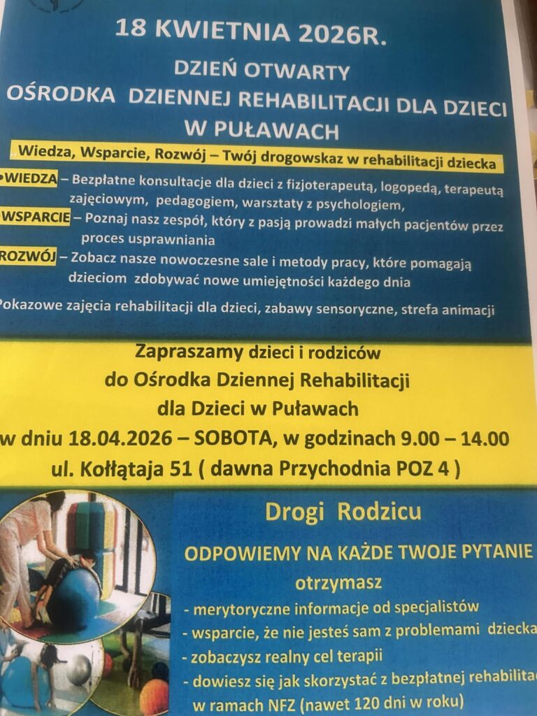 Dzień Otwarty Ośrodka Dziennej Rehabilitacji dla Dzieci w Puławach – w sobotę