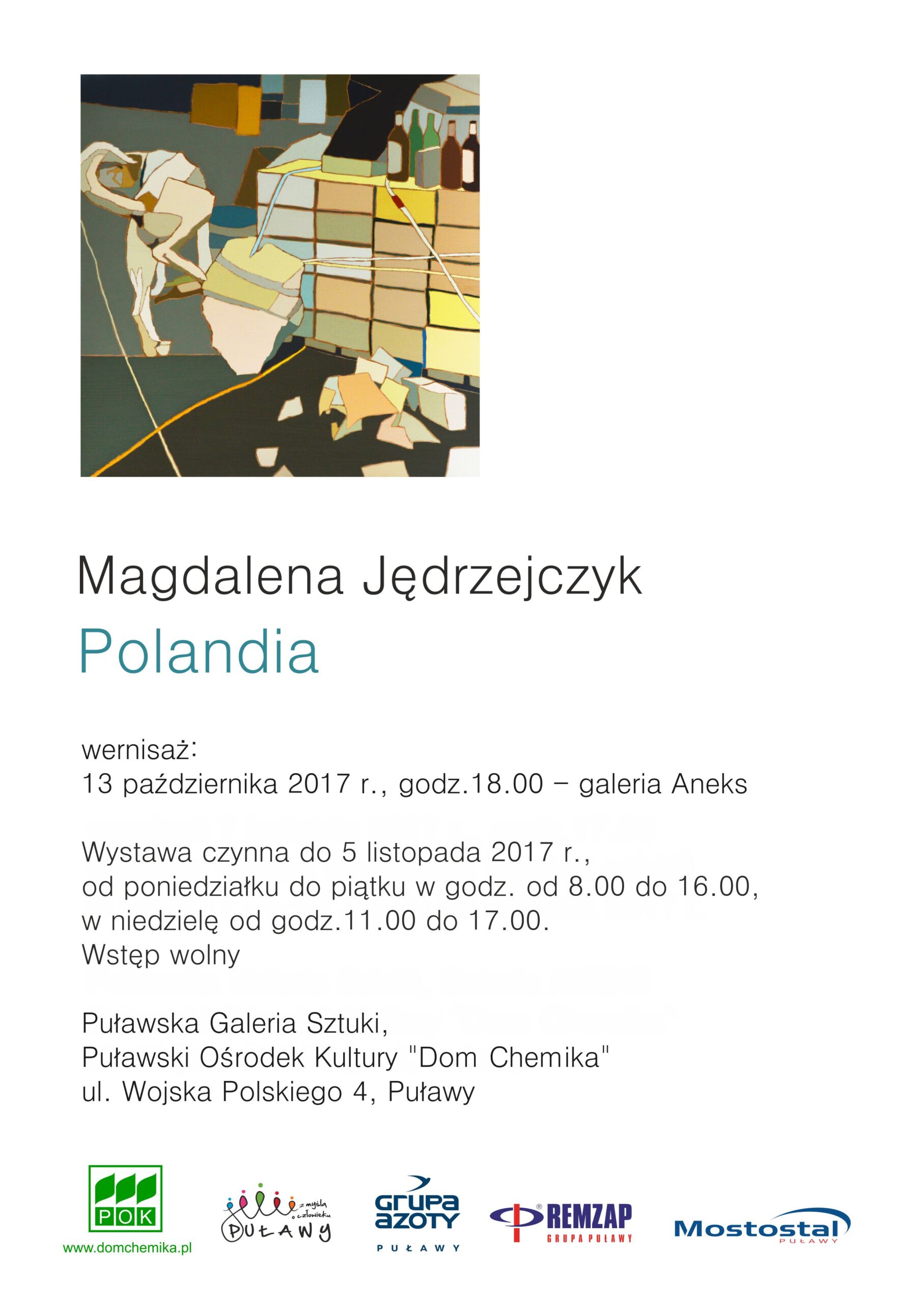 Serdecznie zapraszamy na wernisaż wystawy malarstwa Magdaleny Jędrzejczyk pt. „Polandia”, który odbędzie się 13 października 2017 r. o godzinie 18.00 w Galerii Aneks. Wystawa czynna codziennie (oprócz sobót) do 5 listopada 2017 r., w godzinach od 8.00 do 16.00, w niedzielę od 11:00 do 17:00.