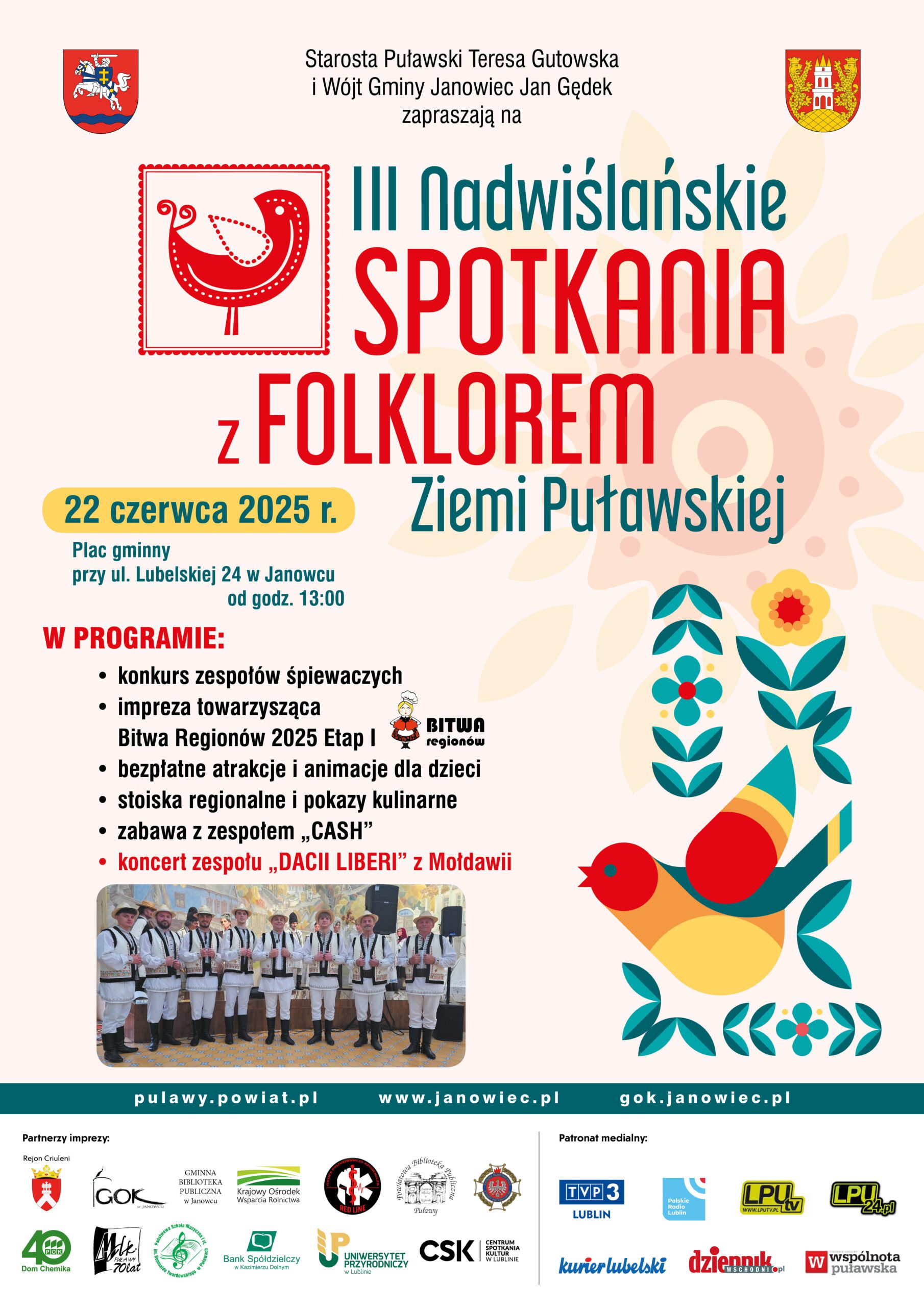W najbliższą niedzielę w godzinach 13:00–18:00 na placu gminnym przy ul. Lubelskiej 24 w Janowcu odbędzie się wyjątkowe wydarzenie kulturalne – 3. edycja Nadwiślańskich Spotkań z Folklorem Ziemi Puławskiej.