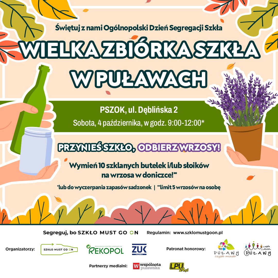W sobotę, 4 października 2025 r., mieszkańcy Puław będą mogli wziąć udział w Wielkiej Zbiórce Szkła, organizowanej w ramach ogólnopolskiej kampanii edukacyjnej „Szkło Must Go On”. Wydarzenie odbędzie na terenie PSZOK-u przy ul. Dęblińskiej 2 w godzinach 9:00–12:00 lub do wyczerpania zapasów roślin.