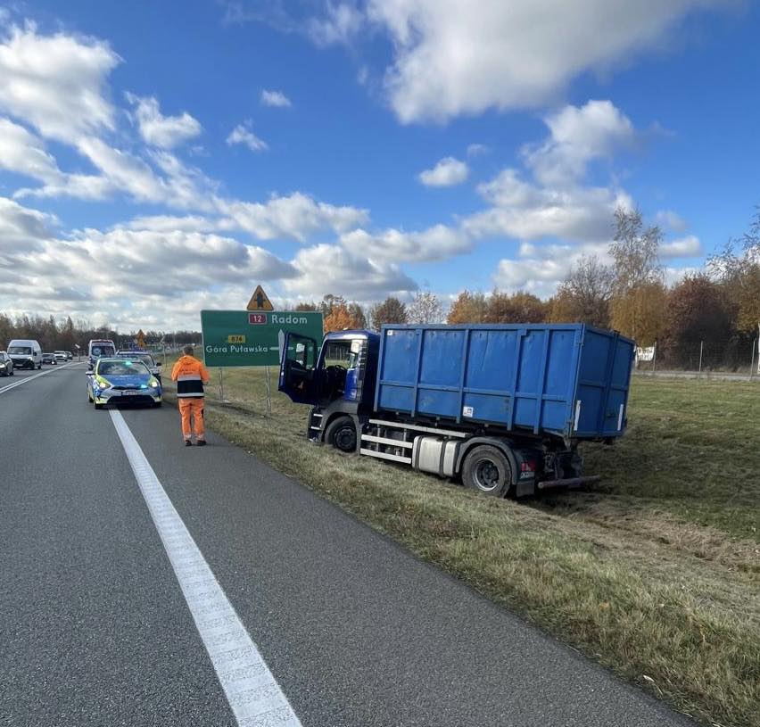 Do niebezpiecznego zdarzenia doszło na drodze ekspresowej S12, na wysokości miejscowości Zarzecze, w kierunku Zwolenia. Kierowca samochodu ciężarowego najprawdopodobniej w wyniku zasłabnięcia stracił panowanie nad pojazdem i zjechał do przydrożnego rowu.