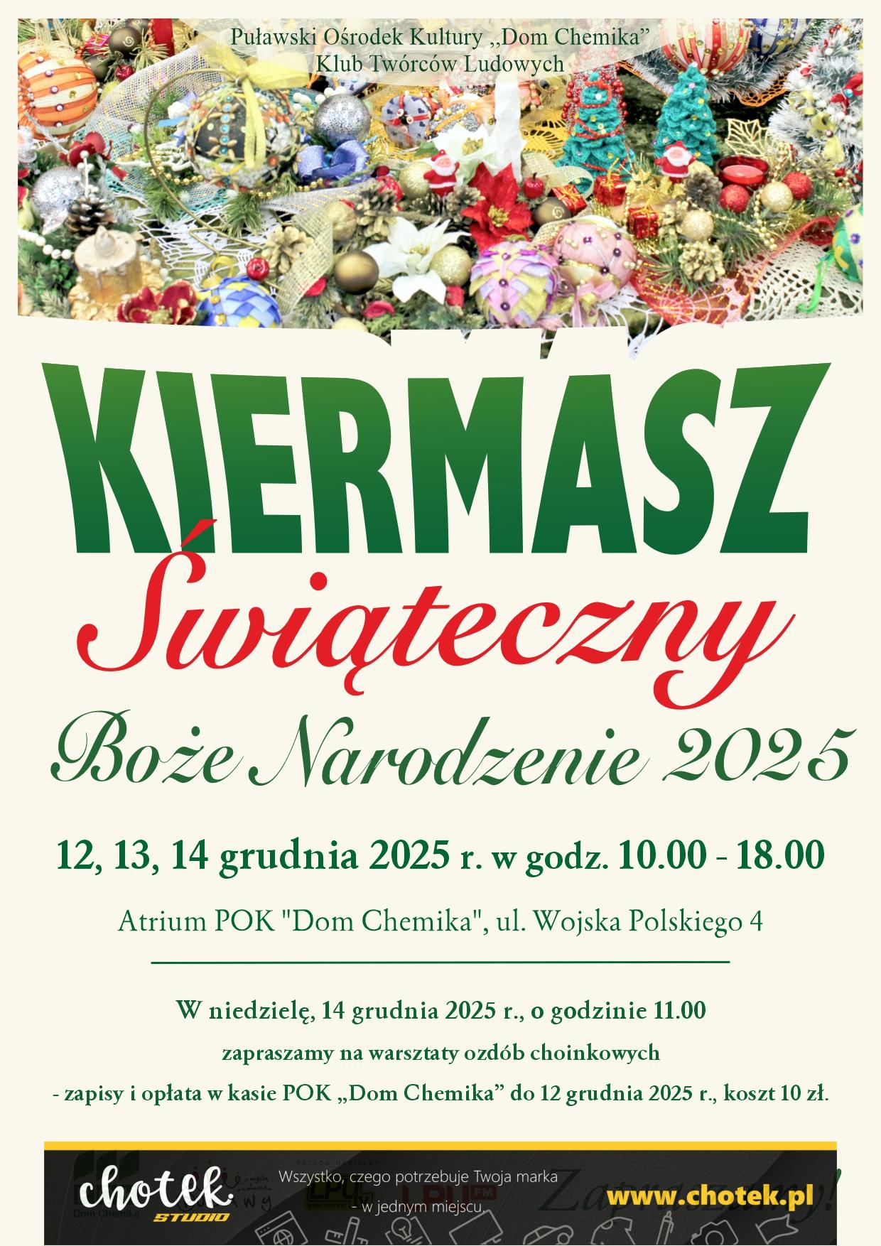 Puławski Ośrodek Kultury „Dom Chemika” po raz kolejny wprowadzi mieszkańców w świąteczny nastrój. Działający przy ośrodku Klub Twórców Ludowych zaprasza na tradycyjny kiermasz bożonarodzeniowy, który odbędzie się w dniach 12–14 grudnia w godz. 10:00–18:00 w Atrium POK „Dom Chemika”.