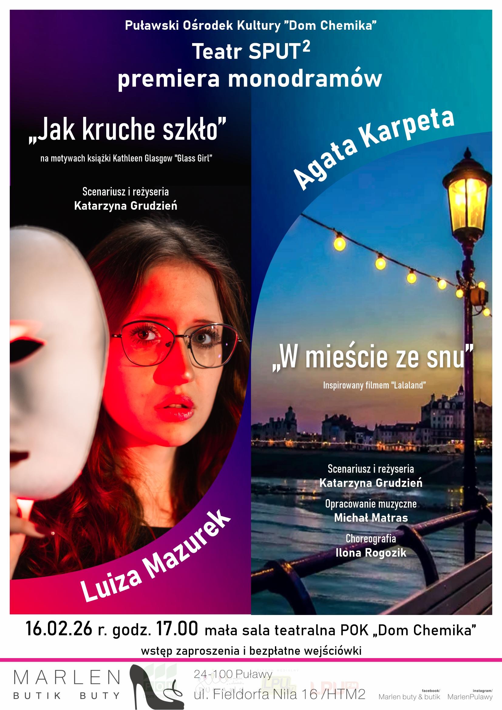 Młode artystki Teatru Sput Kwadrat, działającego w strukturach Puławskiego Ośrodka Kultury „Dom Chemika”, intensywnie przygotowują się do wyjątkowego wydarzenia artystycznego. Już wkrótce widzowie będą mogli zobaczyć premierę dwóch monodramów, które są efektem wielomiesięcznej pracy i twórczych poszukiwań.