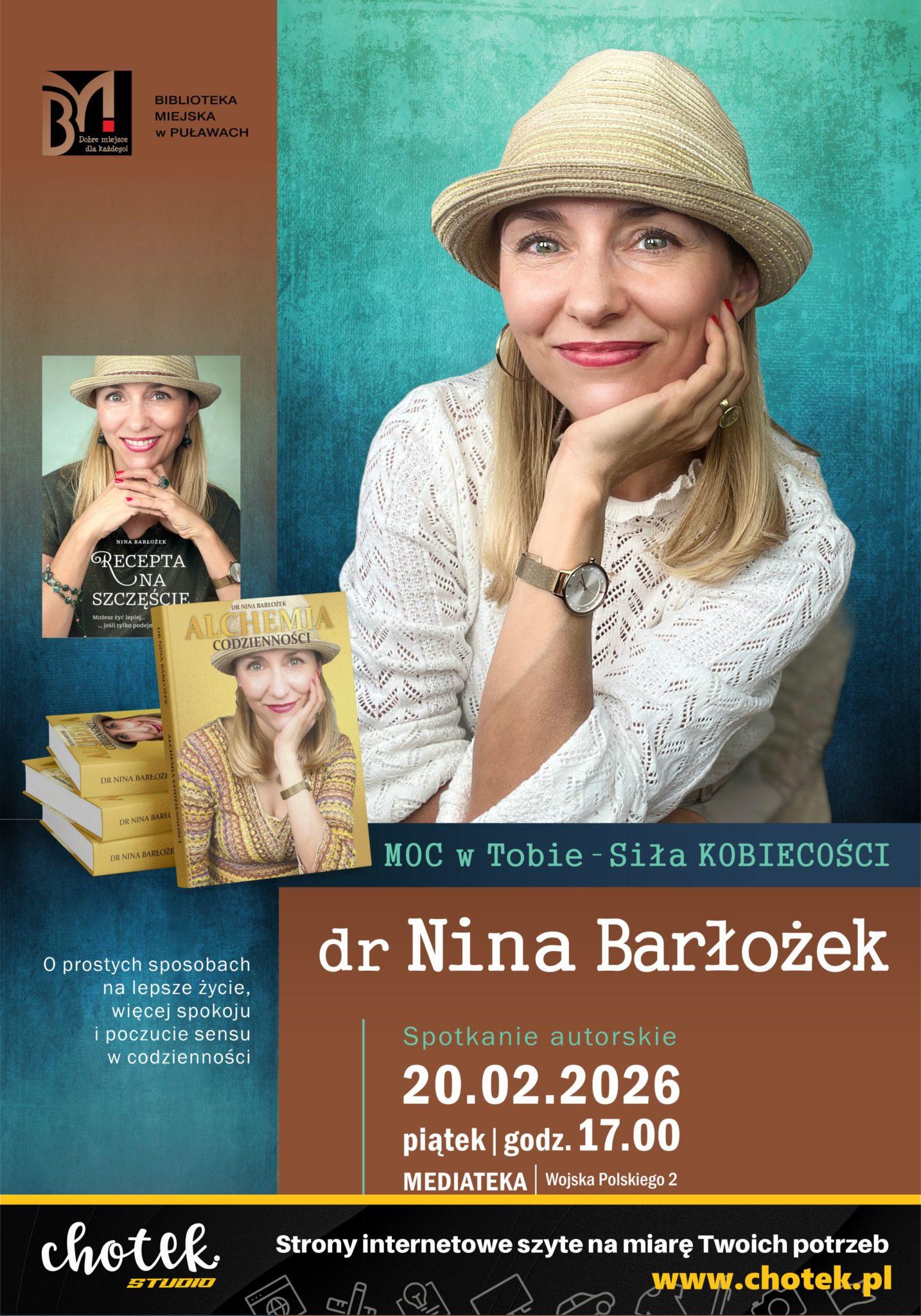 Już niebawem puławska Mediateka zorganizuje spotkanie autorskie z dr Niną Barłożek – psycholożką i autorką książki „Recepta na szczęście”. Wydarzenie odbędzie się pod hasłem „MOC w Tobie – Siła KOBIECOŚCI” i będzie okazją do refleksji, inspirujących rozmów oraz osobistego spotkania z autorką.