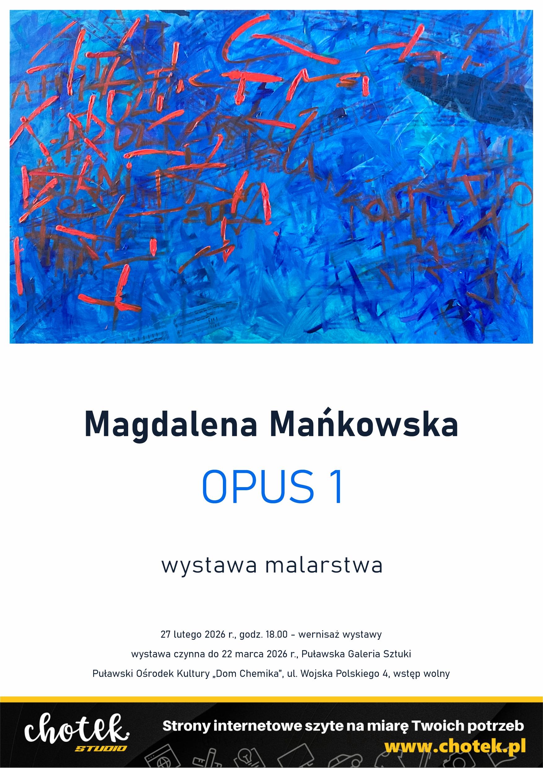 W najbliższy piątek w Puławskiej Galerii Sztuki zaplanowano wernisaż wystawy malarstwa „Opus 1” autorstwa Magdaleny Mańkowskiej. Uroczyste otwarcie ekspozycji odbędzie się w piątek, 27 lutego 2026 roku o godz. 18.00.