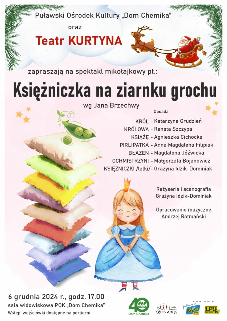 Teatr Kurtyna zaprasza najmłodszych widzów do obejrzenia spektaklu „Księżniczka na ziarnku grochu”. Sztuka zostanie zaprezentowana na scenie Puławskiego Ośrodka Kultury „Dom Chemika” w Mikołajki.