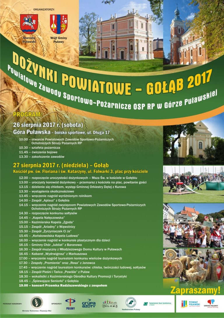 Zapraszamy na Dożynki Powiatowe, które odbędą się 27 sierpnia w Gołębiu oraz Powiatowe Zawody Sportowo Pożarnicze OSP RP, które będą miały miejsce 26 sierpnia w Górze Puławskiej.