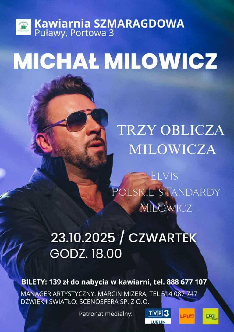 Kawiarnia Szmaragdowa w Puławach zaprasza na wyjątkowy koncert Michała Milowicza – znanego aktora, wokalisty i showmana, który zaprezentuje swoje „Trzy oblicza” na jednej scenie! To muzyczna podróż przez ponadczasowe hity Elvisa Presleya, największe przeboje Krzysztofa Krawczyka i oraz autorskie utwory…