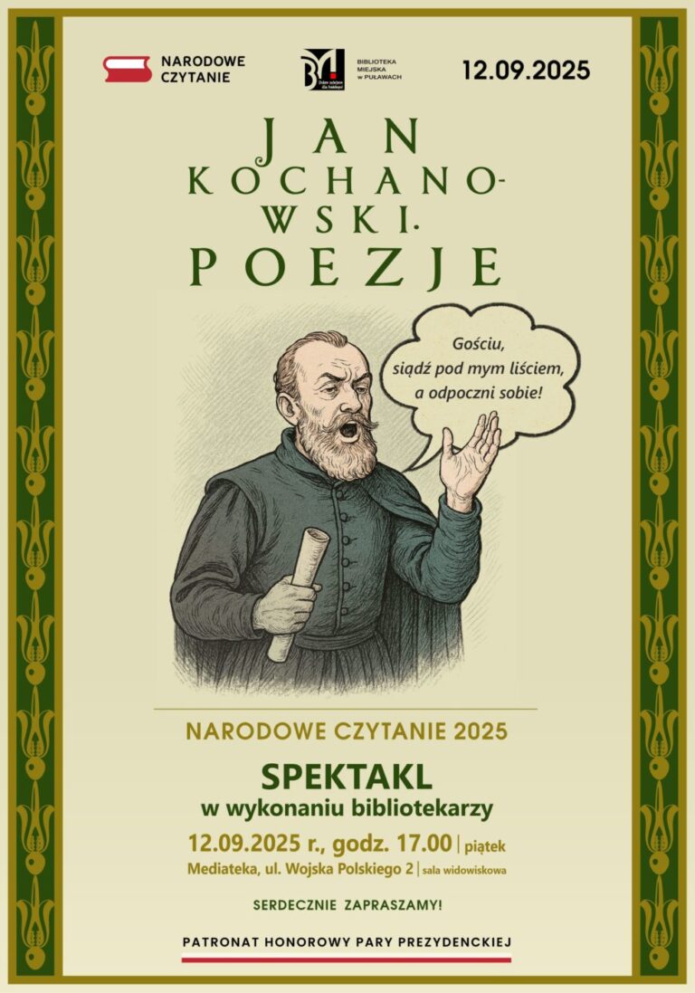 Puławska Biblioteka Miejska zaprasza na organizowane przez siebie wydarzenie w ramach 14. edycji Narodowego Czytania. Podobnie jak w ubiegłych latach, puławscy bibliotekarze przygotują spektakl nawiązujący do tegorocznej lektury. Przypomnijmy, że tym razem jest to poezja Jana Kochanowskiego. W przygotowanej przez…