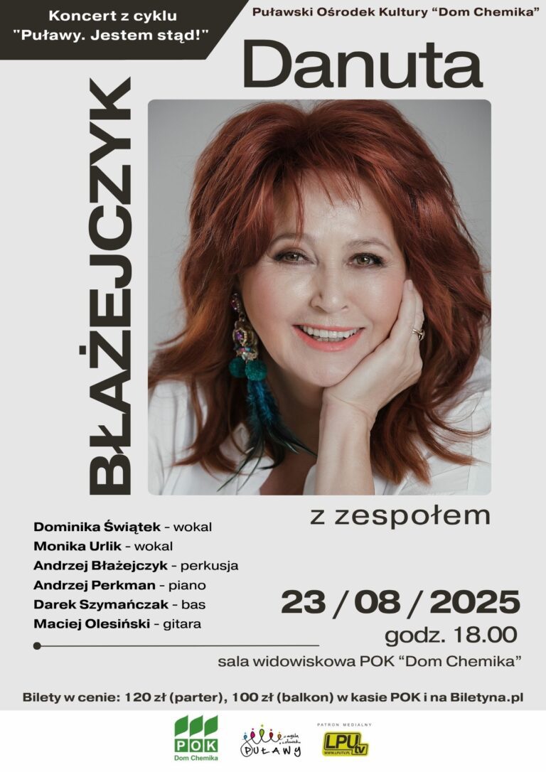 Już 23 sierpnia o godz. 18:00 w sali widowiskowej Puławskiego Ośrodka Kultury „Dom Chemika” wystąpi wyjątkowa artystka – Danuta Błażejczyk. Koncert odbędzie się w ramach cyklu „Puławy. Jestem stąd”, który przypomina o artystach związanych z miastem i prezentuje ich twórczość…