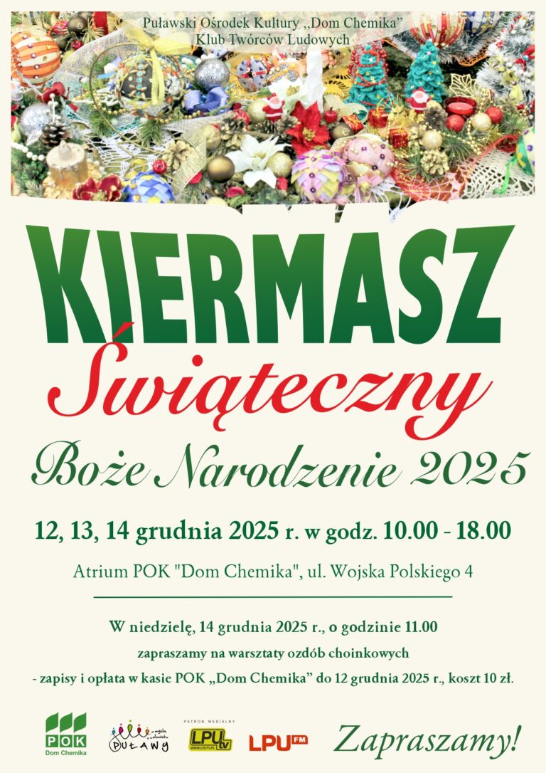Puławski Ośrodek Kultury „Dom Chemika” po raz kolejny wprowadzi mieszkańców w świąteczny nastrój. Działający przy ośrodku Klub Twórców Ludowych zaprasza na tradycyjny kiermasz bożonarodzeniowy, który odbędzie się w dniach 12–14 grudnia w godz. 10:00–18:00 w Atrium POK „Dom Chemika”. To…