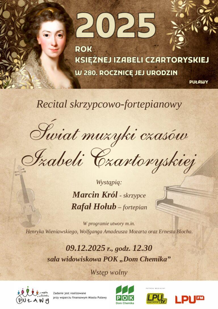We wtorek 9 grudnia. o godz. 12:30 w sali widowiskowej Puławskiego Ośrodka Kultury „Dom Chemika” publiczność będzie miała okazję wysłuchać recitalu skrzypcowo-fortepianowego „Świat muzyki czasów Izabeli Czartoryskiej” . Koncert przeniesie słuchaczy w atmosferę dawnych epok i muzycznych tradycji związanych z…