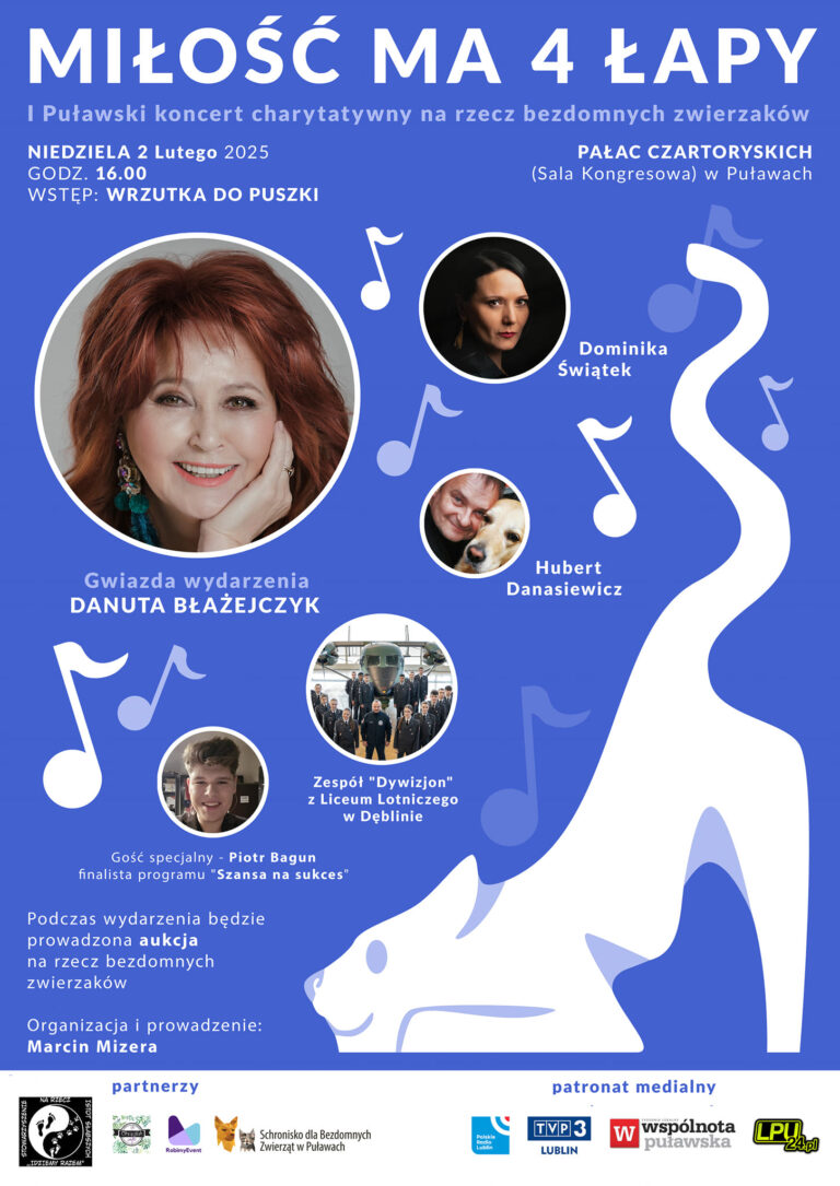 Miłość ma 4 łapy – pod takim hasłem w Puławach odbędzie się pierwszy koncert charytatywny, z którego dochód zostanie przeznaczony na rzecz bezdomnych zwierząt. Gwiazdą wieczoru będzie urodzona w Puławach znana piosenkarka Danuta Błażejczyk.