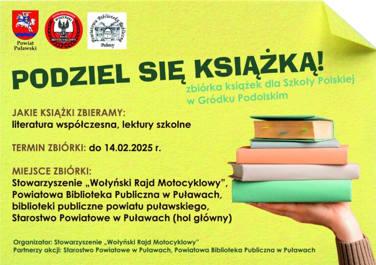 Stowarzyszenie „Wołyński Rajd Motocyklowy” wraz z Powiatową Biblioteką Publiczną w Puławach organizują zbiórkę książek dla szkoły polskiej w Gródku Podolskim na Ukrainie. Akcję pod hasłem „Podziel się książką” wspiera także Starostwo Powiatowe w Puławach.